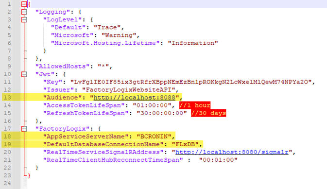Geben Sie in Zeile 13 "Audience" die Adresse und den Port des Webservers ein, auf dem die FactoryLogix-Website ausgeführt werden soll.