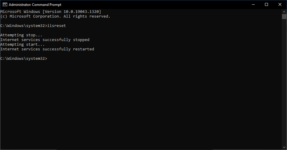 Geben Sie iisreset ein, um den IIS neu zu starten und Ihre IIS-Einstellungen zu aktualisieren.