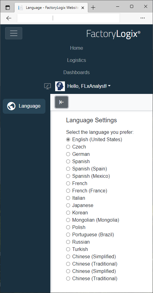 Die von Ihnen gewählte Standardsprache wird für die FactoryLogix-Website verwendet.