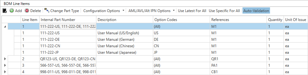 To avoid quantity errors, you group common line items using the Configuration Options drop-down above the BOM.