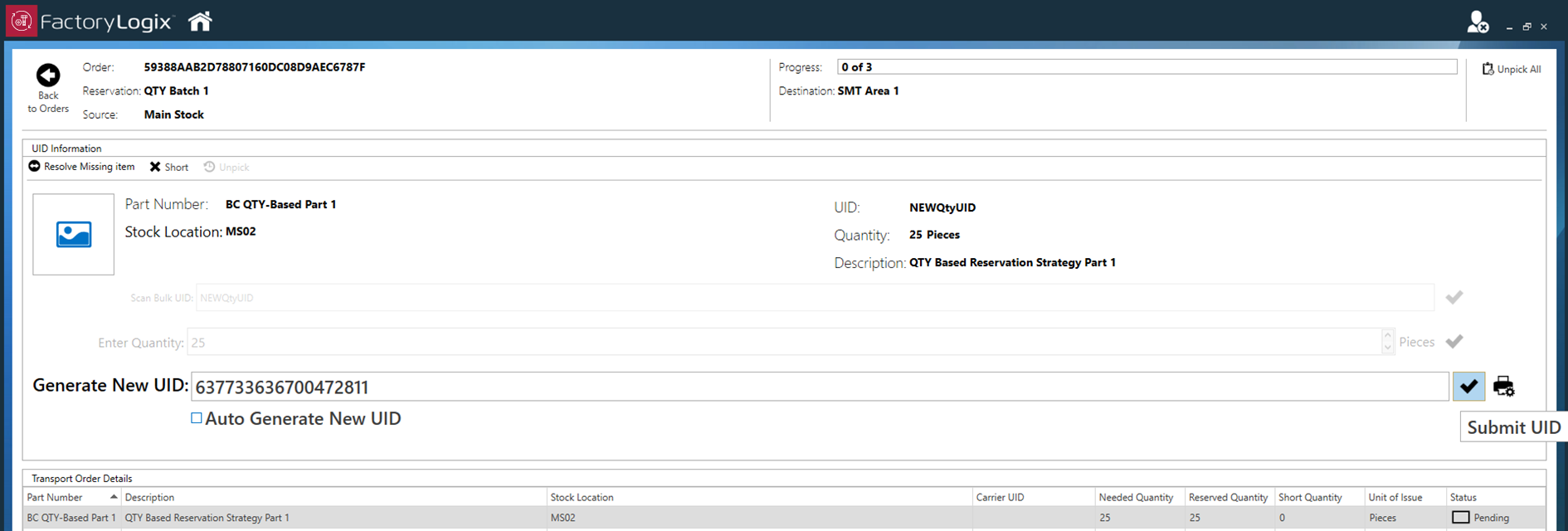 Bulk parts such as hardware and other non-serialized items are normally kitted using a quantity-based picking method. In this case, operators executing this type of transport order are presented with a list similar to the UID-based method, where a specific stock location and UID are specified, but that is where the similarities end. Scanning the bulk item UID (the UID of the bag, box, or bin containing the needed parts) will then advance to the next entry field: the quantity. The needed quantity will be filled in automatically, and the intent is that the operator will then count out the required number of items, confirm this quantity by selecting the check mark to the right of the Enter Quantity field, then FactoryLogix will “split” off that many items from the original UID (decrementing that many from the source), and then generate a new UID which represents the exact quantity picked. This feature can even generate a material label at that time. The default behavior is to auto-generate the new UID using the UID Format configured in the NPI Templates and Standards area or will simply use a “Tick Count” to produce a UID. You may un-check the “Auto Generate UID” option to enter your own UID. Select the check mark to the right to confirm and complete the picking of this bulk (qty-based) item.