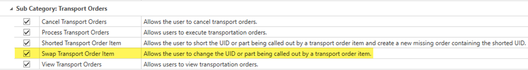 Swap Transport Order Item permission