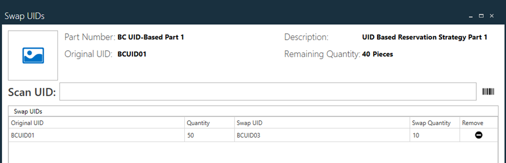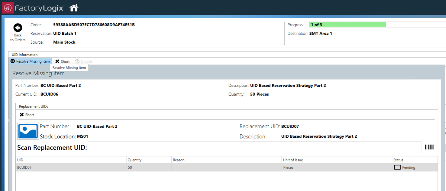 You can see in the following illustration that the original UID called for a Quantity of 50 pieces and the picked UID only contained 10 pieces, so this dialog is alerting the operator that they still need to pick one or more UIDs to satisfy the 40 remaining parts needed.